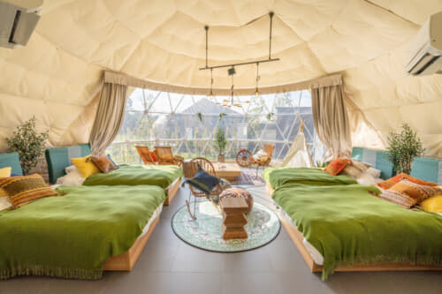 全棟500㎡超、客室温泉・プール付。富士山を望む山中湖のラグジュアリーグランピング。