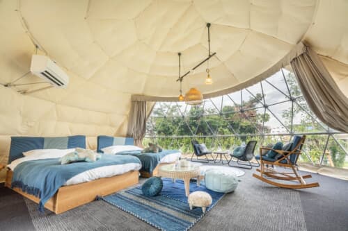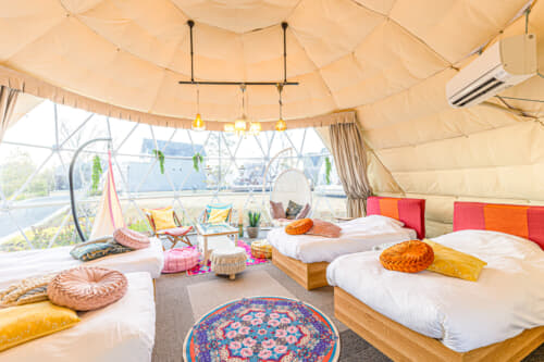 温泉・プール付ヴィラとドーム型テント。大人数対応の多様なグランピング施設。