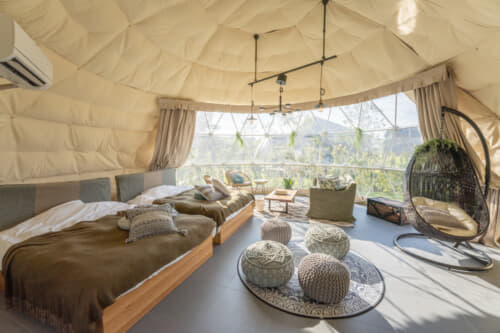 全棟500㎡超、客室温泉・プール付。富士山を望む山中湖のラグジュアリーグランピング。