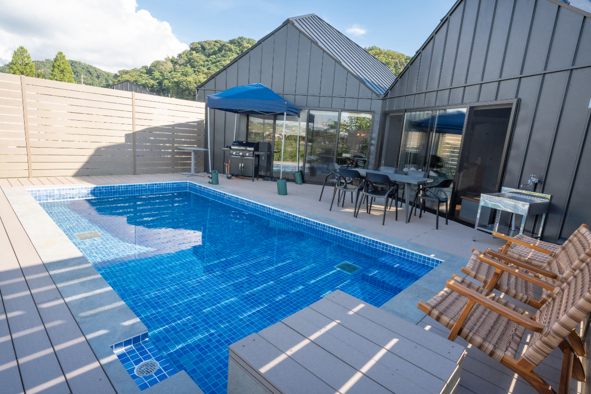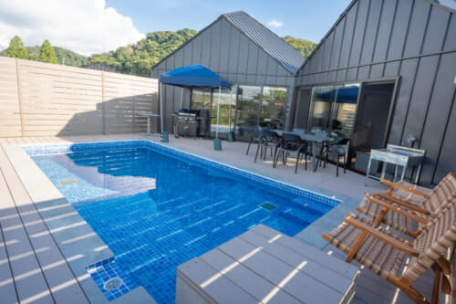 南房総の海を望むテラス、プライベートプール、客室温泉完備の贅沢なリゾートヴィラ。