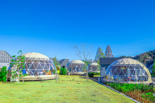 温泉・プール付ヴィラとドーム型テント。大人数対応の多様なグランピング施設。
